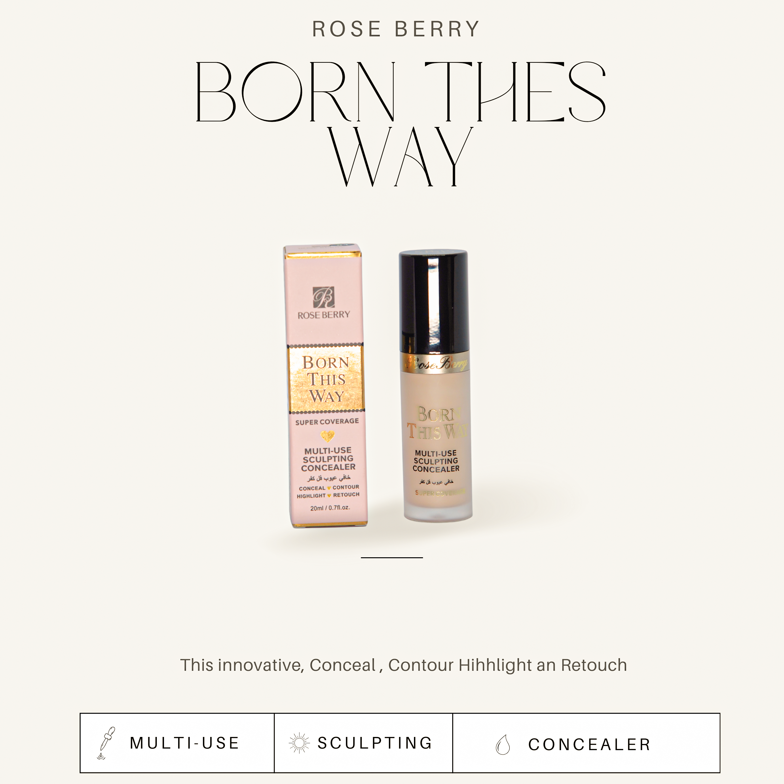 Roseberry Born This Way Concealer is a high-coverage, lightweight concealer that seamlessly hides imperfections, dark circles, and blemishes. Its creamy, blendable formula provides a natural, long-lasting finish without creasing or caking.